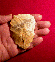 | A beautiful Mesolithic levallois flake in translucent quartzite 7 cms long with a lovely pale buff glossy patination, in perfectly preserved condition. There is a well-defined positive bulb of percussion with an eralleur scar and a small amount of cortex at the distal end. This is a not uncommon type of Mesolithic tool, though its exact purpose in unknown. Found on the Hampshire/West Sussex borders, southern England. gap Not for sale |